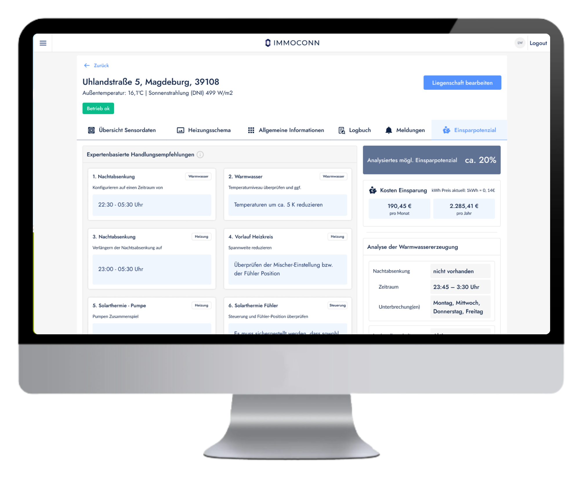Immoconn bietet digitale und automatisierte Lösungen zur nachhaltigen Einstellung Ihrer Heizungsanlagen. Unser Expertenteam steht Ihnen von der Beratung über die Installation bis hin zur Datenauswertung zur Seite. Wir unterstützen Sie dabei, die Energieeffizienz Ihrer Immobilien zu steigern, CO₂-Emissionen einzusparen sowie gesetzliche Vorgaben einzuhalten und ambitionierte Net-Zero-Ziele zu erreichen.