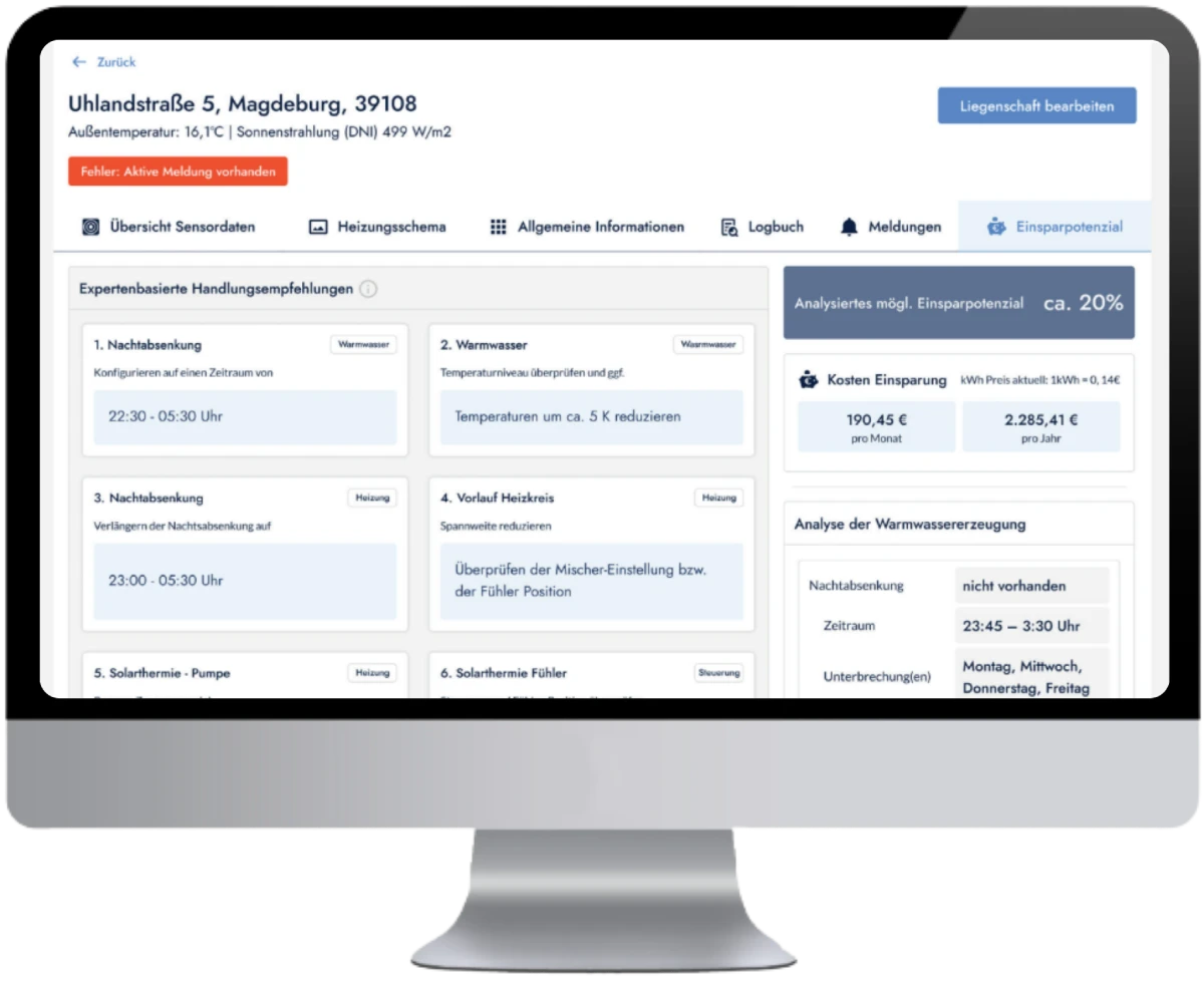 Durch die kontinuierliche Erfassung und Analyse aller relevanten Daten erkennt Immoconn frühzeitig ineffiziente Betriebsweisen. So lassen sich Heizungsanlagen gezielt optimieren, Energieverbrauch reduzieren und unnötige Kosten vermeiden.