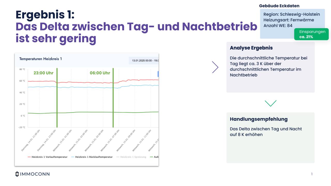 Im ersten Beispiel sehen wir uns ein fernwärmebeheiztes Gebäude mit 84 Wohneinheiten an. Eine Nachtabsenkung ist von 23 Uhr bis 6 Uhr eingestellt. In der Plattform sehen wir die Vorlauftemperatur, die Rücklauftemperatur und beziehen auch die Außentemperatur mit ein. Die Nachtabsenkung ist zwar vorhanden, aber mit einem zu geringen Delta zwischen Tag und Nachtschaltung. Aktuell sind es nur 3 Kelvin Unterschied. Hier ist die Empfehlung, das Ganze auf ein Delta von ca. 8 Kelvin zu erhöhen. In Summe können wir durch die Umsetzung dieser und zusätzlicher weiterer Maßnahmen im Gesamtsystem 21 Prozent Energie einsparen.